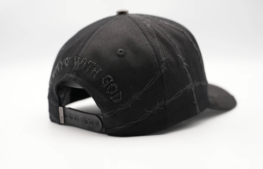• Design Highlights: Barbed wire embroidery, triple cross centerpiece, branded interior, “Stay With God” back detail