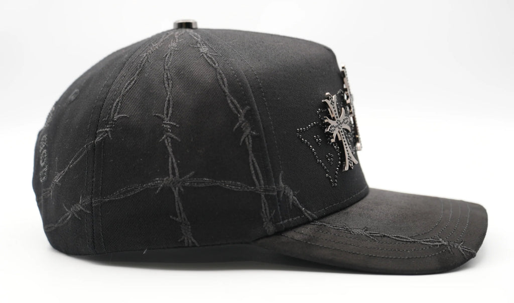 The cap’s matte black finish is complemented by embroidered barbed wire patterns wrapping around the crown and visor, creating a rugged yet refined statement piece. Inside, the custom-branded lining and the iconic embroidered logo under the brim showcase exceptional attention to detail.