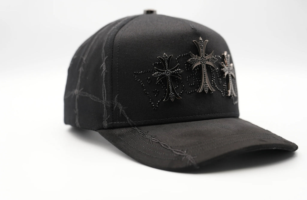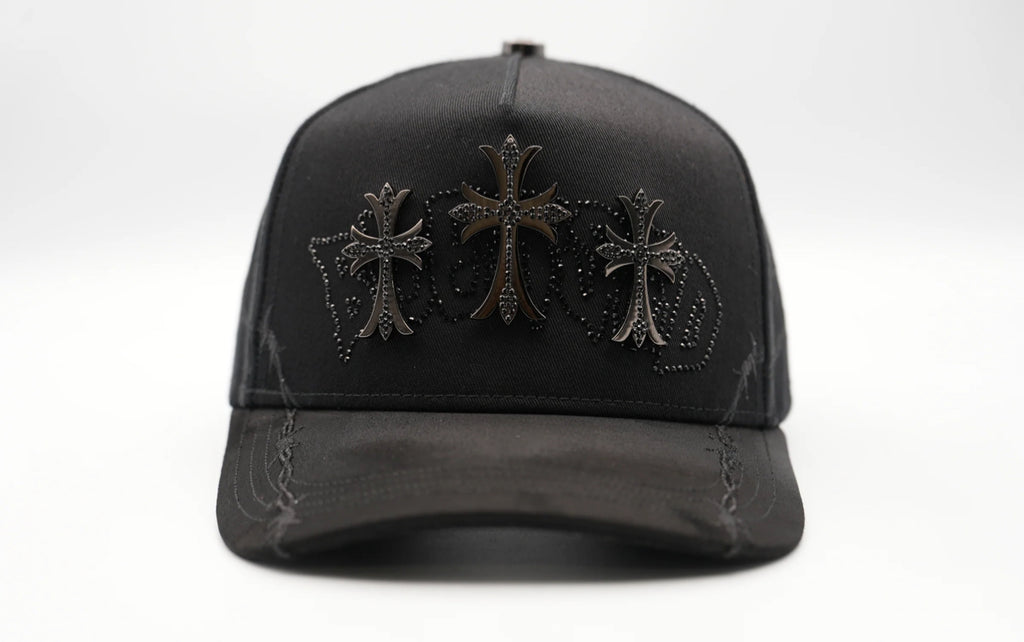 Step into bold sophistication with the Triple Cross Black Edition Cap — a powerful blend of luxury craftsmanship and streetwear edge. This premium cap features three raised metal cross emblems across the front, symbolizing strength and resilience. Each cross is framed by subtle black rhinestone detailing, adding texture and depth without losing its stealth aesthetic.